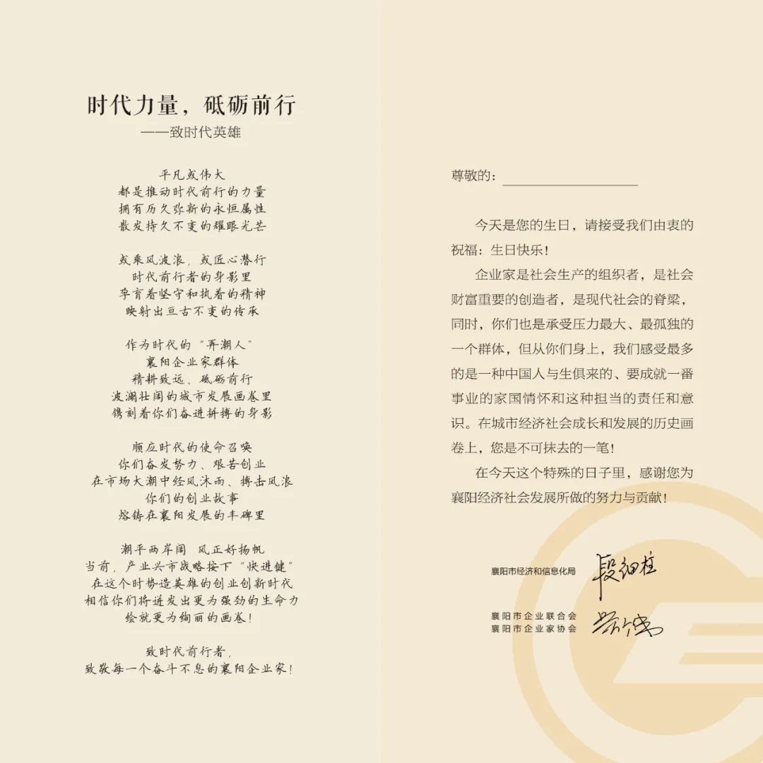 襄陽(yáng)市企業(yè)聯(lián)合會(huì)數(shù)據(jù)部部長(zhǎng)劉輝向博拉經(jīng)緯纖維有限公司總經(jīng)理朱永軍贈(zèng)送《襄陽(yáng)英雄 青春永駐》生日賀卡