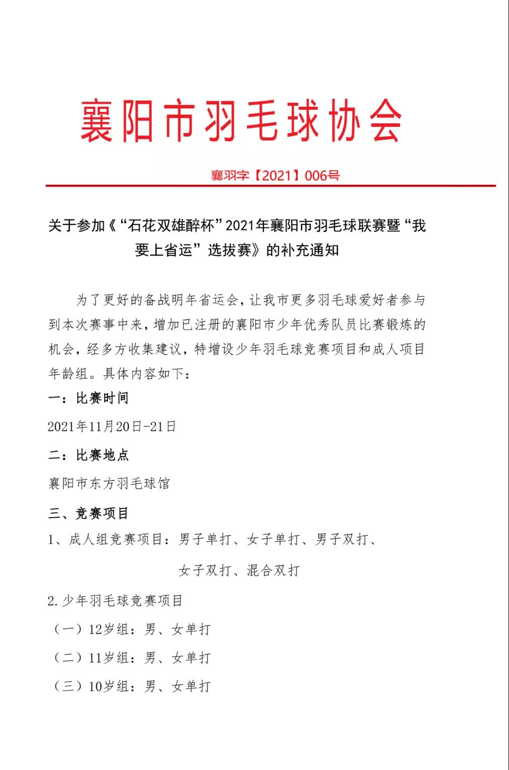 以下是《“雙雄醉杯”2021年襄陽市羽毛球聯(lián)賽暨“我要上省運”選拔賽》的補充通知: