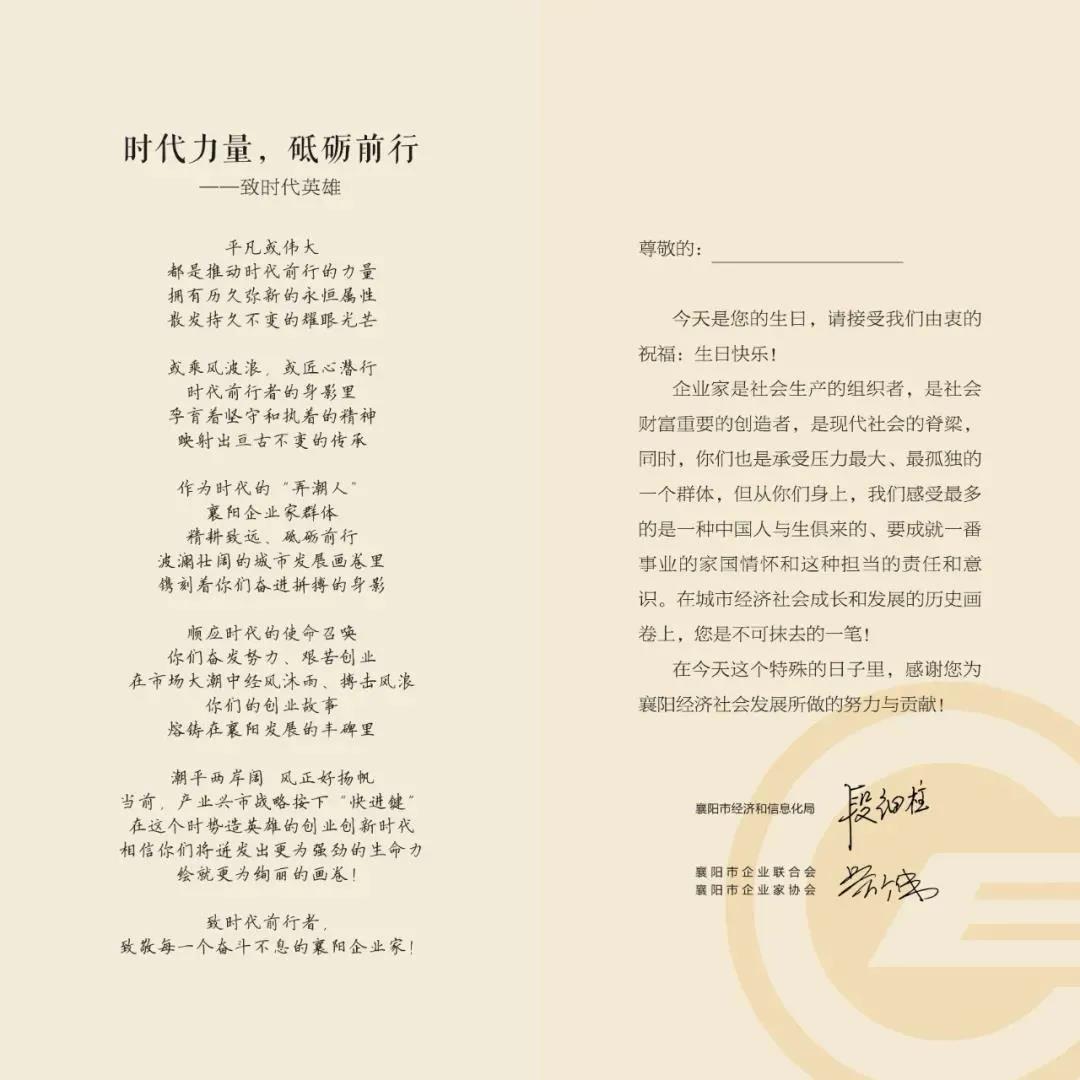 企業(yè)家是襄陽繁榮發(fā)展的主要動力,是襄陽產(chǎn)業(yè)強市的主力軍。根據(jù)襄陽市經(jīng)信局相關(guān)文件要求,襄陽企聯(lián)于2021年5月開展為期一年的“企業(yè)家‘暖心’工程暨企業(yè)家生日蛋糕禮送活動”,決定由石花雙雄醉和襄陽企聯(lián)為企業(yè)家禮送生日蛋糕提供精益服務,讓一方小小的蛋糕,傳遞濃濃的深情。表達對襄陽企業(yè)家的濃濃敬意,傳達黨委政府及其職能部門、商協(xié)會組織和社會各界對襄陽企業(yè)家的深情祝福,助力襄陽經(jīng)濟社會高質(zhì)量發(fā)展。