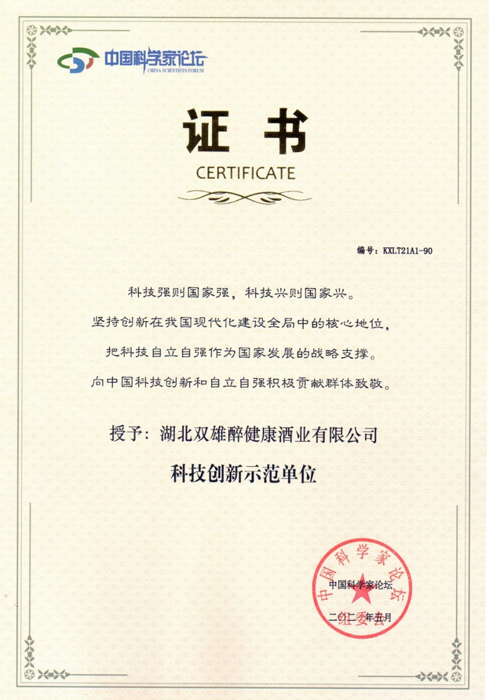 2021年5月22日,雙雄醉健康酒業(yè)被中國科學家論壇授予科技創(chuàng)新示范單位。中國科學家論壇是在著名科學家、時任全國人大常委會副委員長、中國科協(xié)主席周光召院士特別關(guān)懷和支持下,于2002年創(chuàng)辦,已成功舉辦了18屆。十九年來,中國科學家論壇得到了科技部、中國科學院、中國工程院、中國科協(xié)、國家自然科學基金會、清華大學、北京大學等,以及社會各界的大力支持,作為我國科技界最有影響力的交流合作平臺之一。