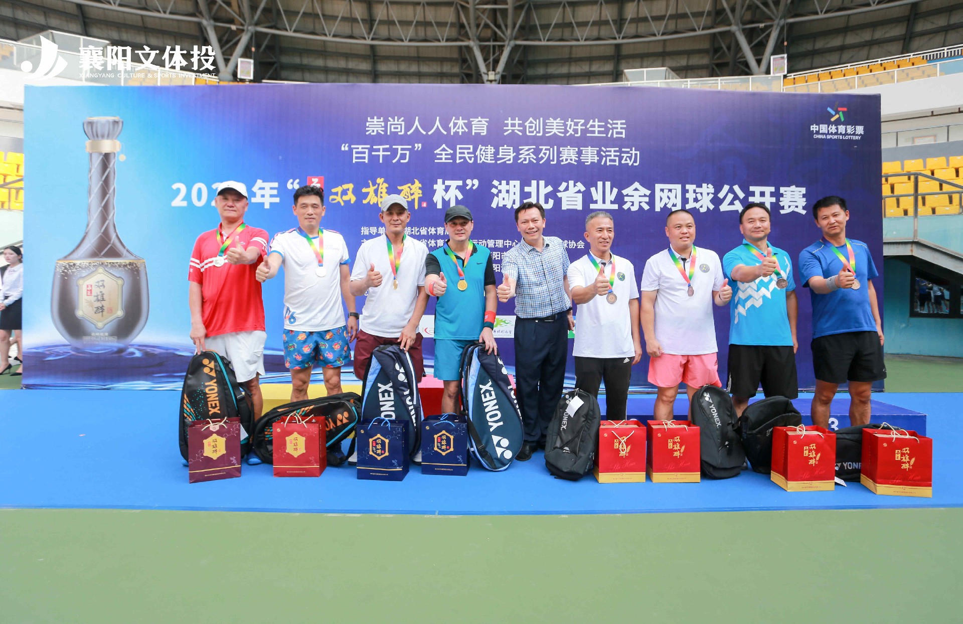 汗水不負(fù)拼搏,舉杯雙雄醉,共享榮耀時(shí)刻。為期兩天的比賽圓滿落幕,獎(jiǎng)項(xiàng)名次依次決出,大家合影留念,雙雄醉為各位獲獎(jiǎng)運(yùn)動(dòng)員準(zhǔn)備了精致的禮品,希望大家能夠積極地投入健身、享受健康,品雙雄醉酒,爭當(dāng)網(wǎng)球英雄。