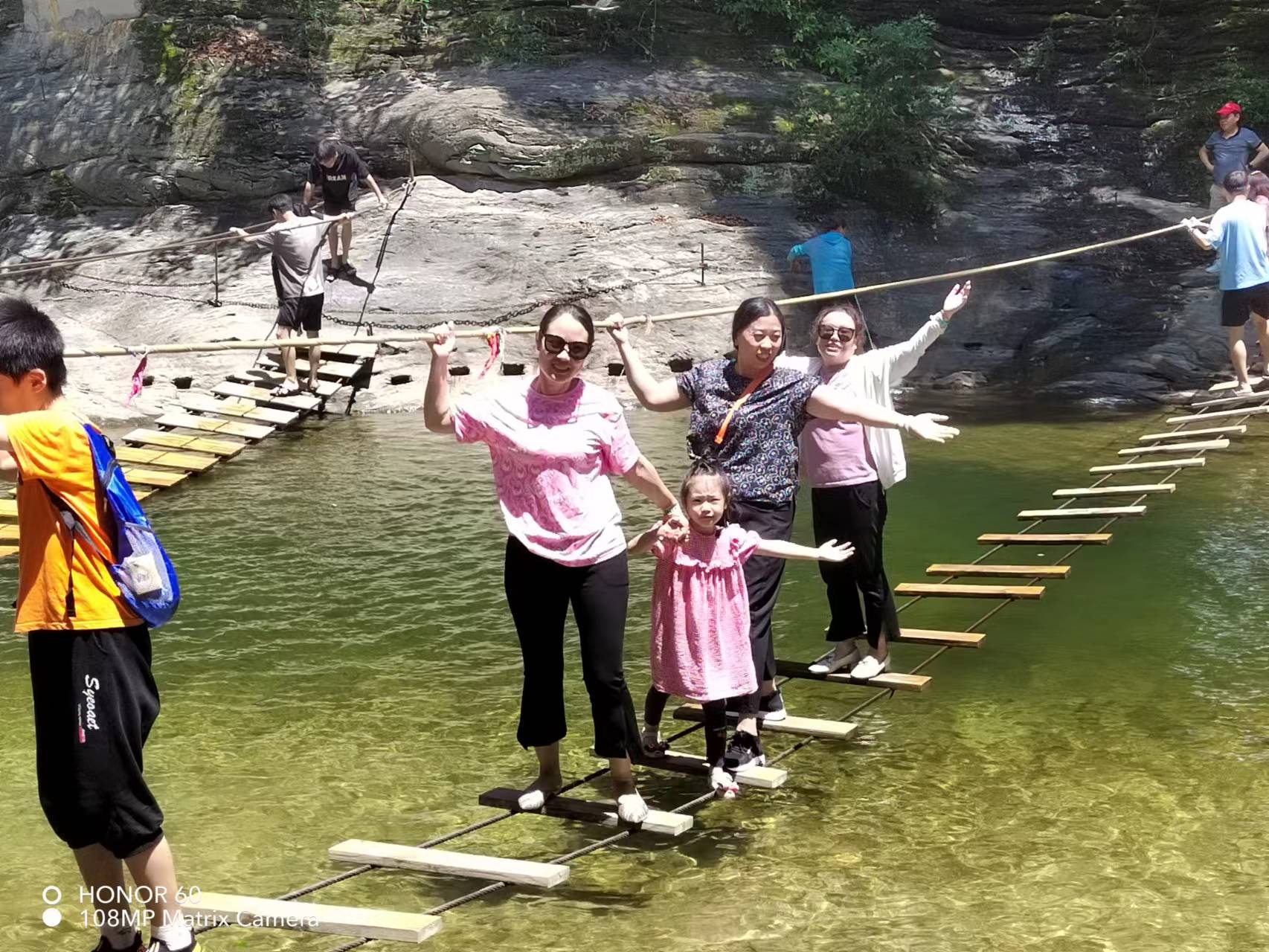 大家置身于山青水秀的班河大峽谷中,無不贊嘆大自然的鬼斧神工。步步驚心、彩虹吊橋、水上秋千、彩虹鋼絲橋、漂浮船、竹筏橋等水上項目讓人心驚膽戰(zhàn)而又躍躍欲試。