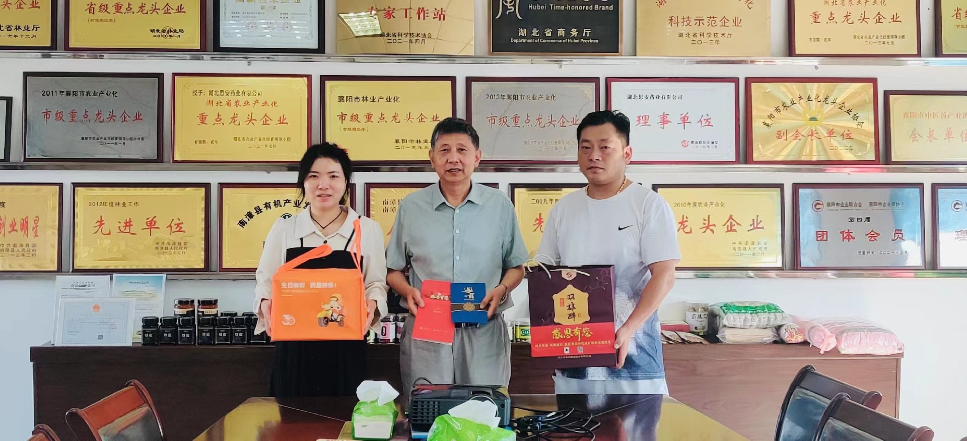 8月4日,這天恰好是湖北思安藥業(yè)有限公司總經(jīng)理劉軍的生日,襄陽企聯(lián)代表、雙雄醉南漳代理合伙人胡家全帶著《襄陽英雄 青春永駐》的生日賀卡、生日蛋糕和雙雄醉SOD健康酒,來到思安藥業(yè),為過生日的劉總送上生日祝福,祝劉總生日快樂。
