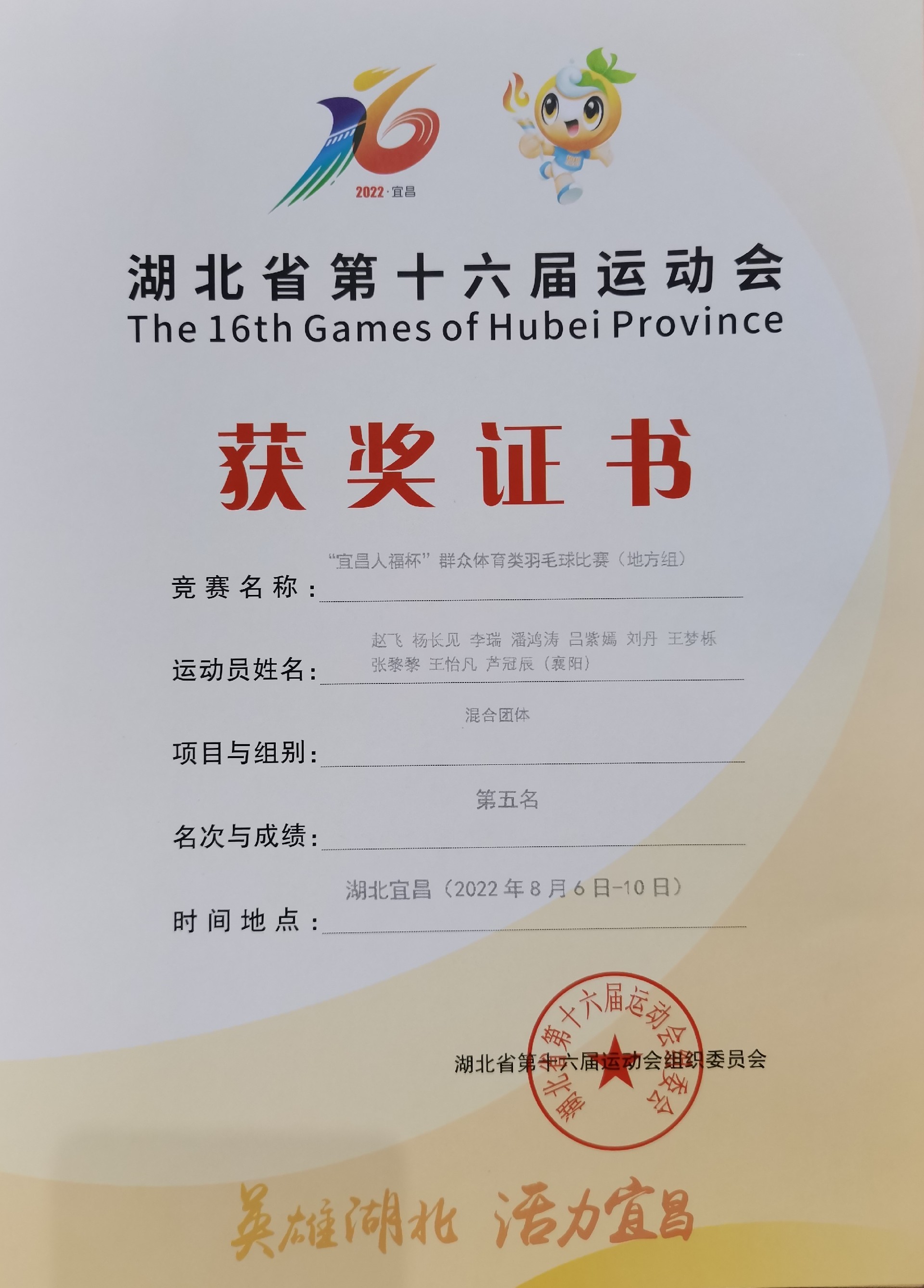 四年磨一劍,一朝展鋒芒。8月6日——10日,湖北省第十六屆運動會“宜昌人福杯”群眾體育類羽毛球比賽(地方組)于宜昌市隆重舉行,來自省內(nèi)一千多位運動健兒齊聚宜昌、共同參賽。經(jīng)過全體隊員的努力拼搏,襄陽羽毛球代表隊榮獲湖北省第十六屆運動會混合團(tuán)體第五名的好成績,載譽而歸!