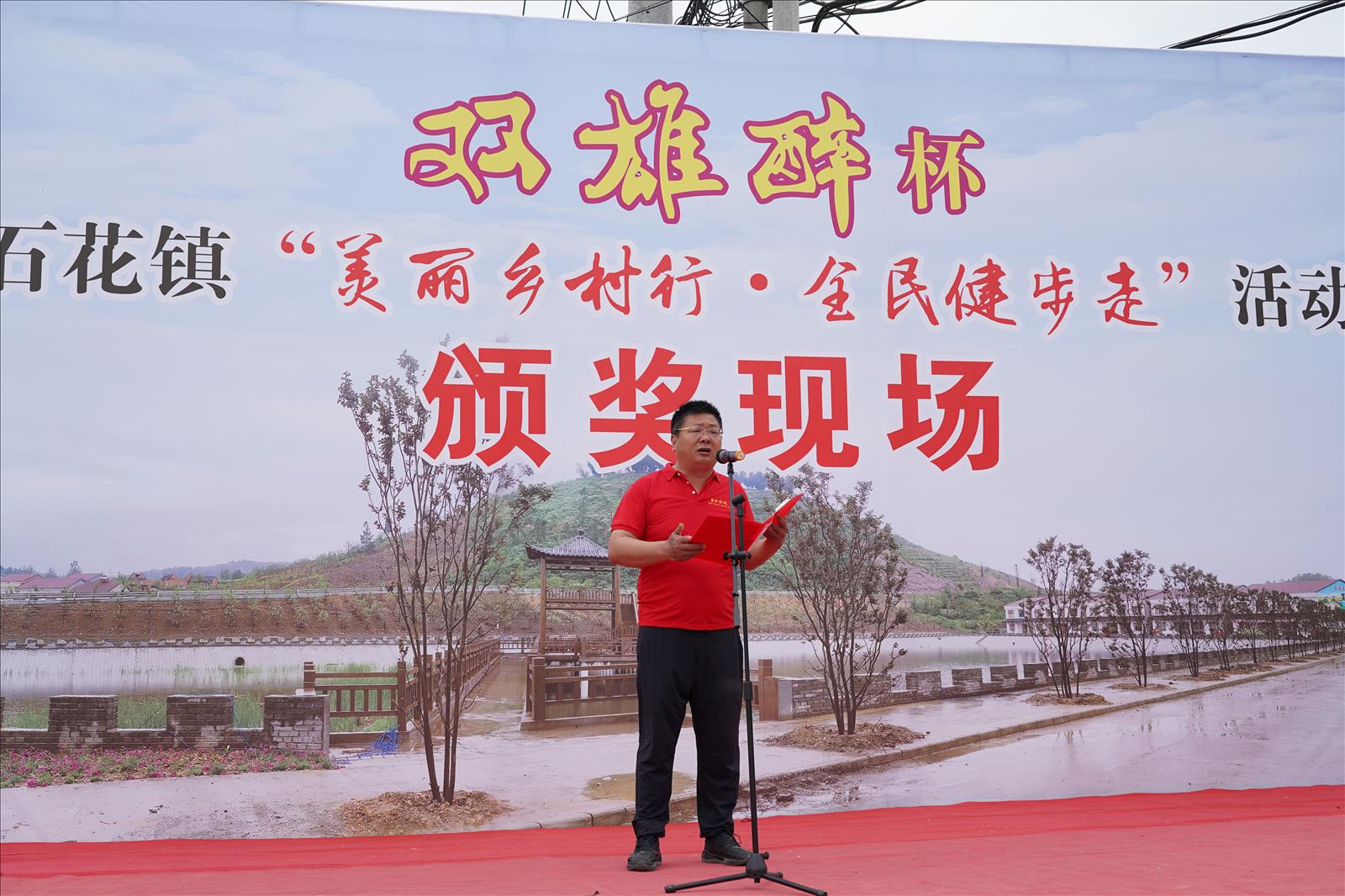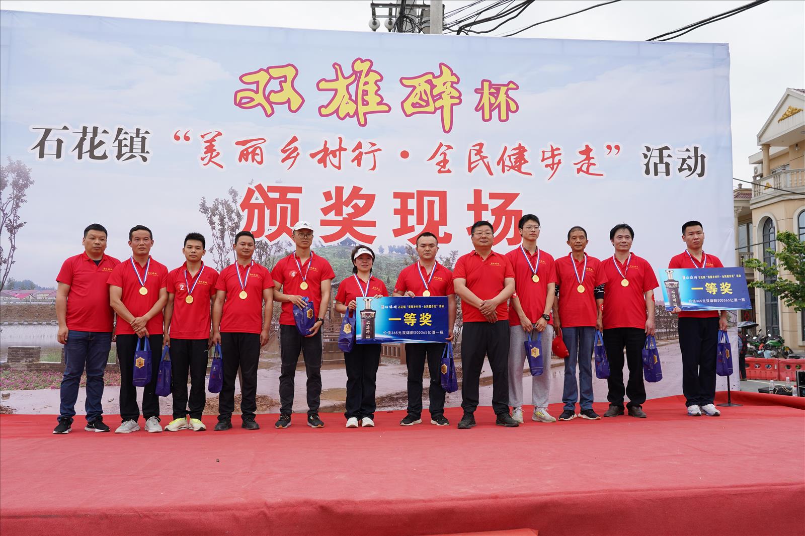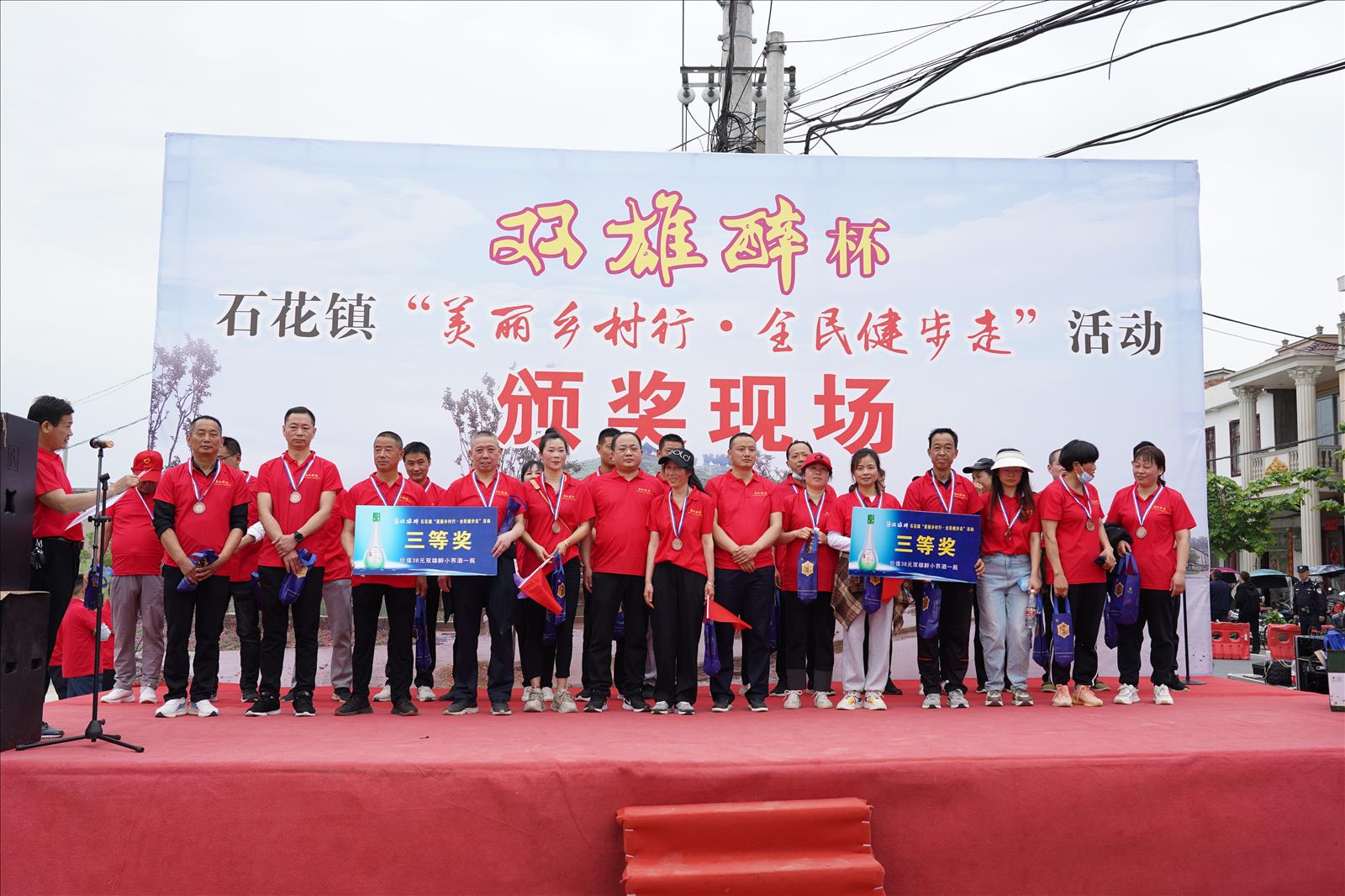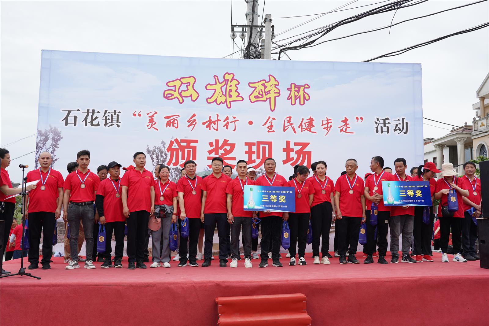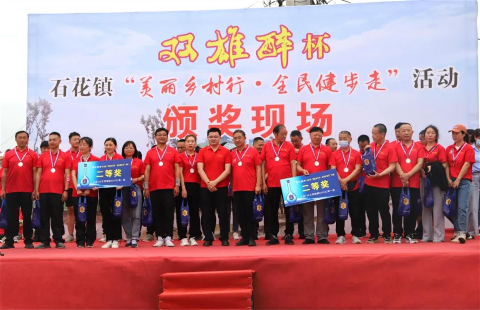 上午10點,健步走參賽者陸續(xù)抵達終點,圓滿完成了健步走任務。石花鎮(zhèn)黨委班子成員為完成健步走的前100名選手頒獎,石花鎮(zhèn)委書記熊偉、石花雙雄醉銷售總監(jiān)郭春偉為10名一等獎選手頒發(fā)獎牌、獎品。