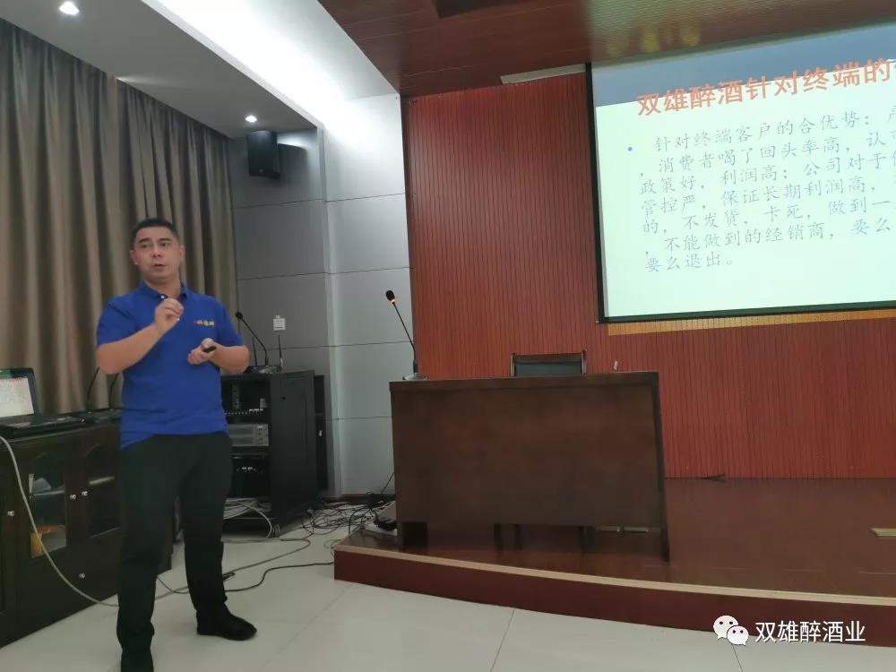市場總監(jiān)羅慶山為大家作了品牌內(nèi)涵培訓(xùn),解讀了雙雄醉“傳統(tǒng)工藝、生態(tài)釀造、專家親釀帶來的更好品質(zhì),采用黑小麥等原料、富含SOD等更多健康因子而更多健康,口感好、醒酒快等更爽體驗”三大核心賣點,他對雙雄醉五款產(chǎn)品、價格及消費人群定位進行了一一講解。隨后,他就“如何能成為銷售精英”為題為大家作了第二個單元內(nèi)容的培訓(xùn),重點講解了如何贏得客戶信任、成交時機的把握、客戶異議的處理等等業(yè)務(wù)知識。